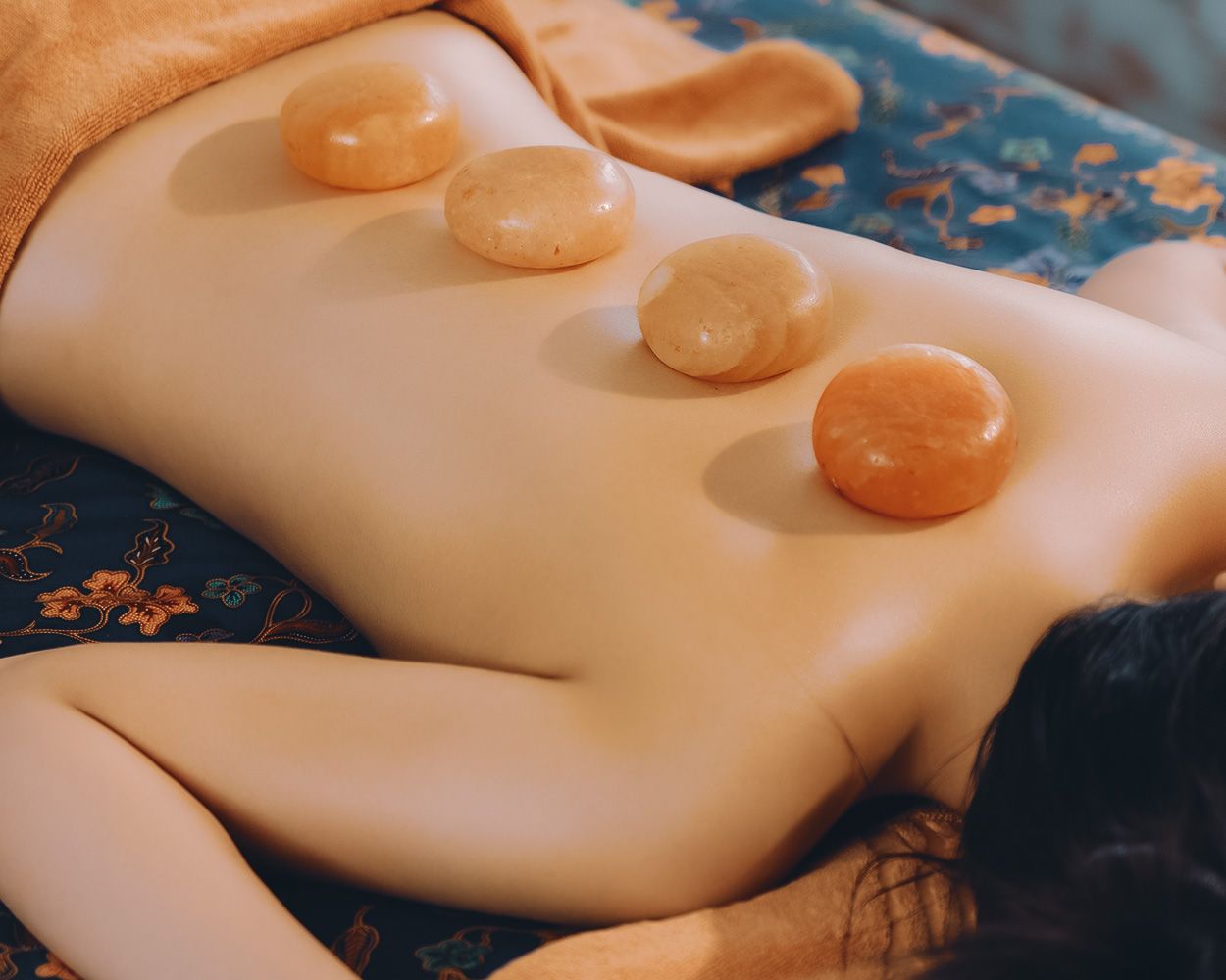 天然のヒマラヤ産・ミネラルソルトを用いたストーンマッサージは、全身をトリートメントし、血液循環を促進しつつ、古い角質を除去します。